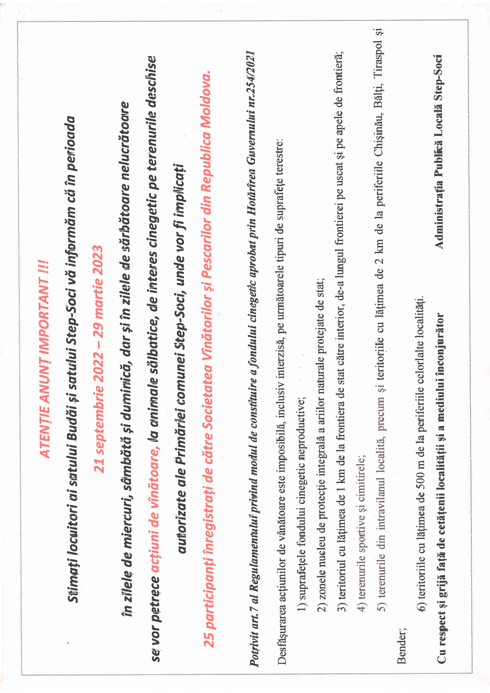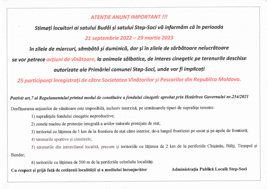 Anunț cu privire la acțiuni de vânătoare