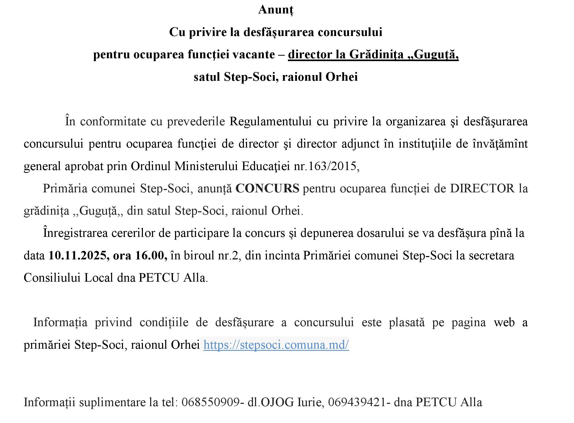 Anunț Cu privire la desfășurarea concursului pentru ocuparea funcţiei vacante – director la Grădinița ,,Guguță, satul Step-Soci, raionul Orhei