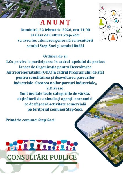 Autoritatea executivă а Consiliului local Step-Soci, raionul Orhei inițiază începând cu data de 09.02.2026 consultarea publică […]